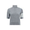 Thom Browne’s Virgin Wool Turtleneck Sweater is a refined and sophisticated piece that combines elegance with distinctive details. With a ribbed turtleneck and short sleeves, it features a monochrome pattern enhanced by contrasting hems. The brand’s iconic bands on the left sleeve and the ribbed hem with slight side slits add a touch of originality.