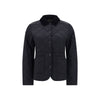 The Deveron Quilt Jacket by Barbour, classic velvet ribbed collar, snap button front closure, two slit patch pockets on front, iconic brand monogram embroidered on front, all-over quilted design, monochrome pattern, regular fit.