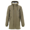 Long Green Fabric Parka Jacket with Large Pockets. Front zip and covered button closure, two large side pockets with snap closures, side pockets, and an adjustable hood. The inside of the upper body and hood are lined with Sherpa fur. Composition: 74% Nylon, 26% Cotton