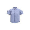 The striped poplin Shirt by Sacai delivers a contemporary, experimental aesthetic. Crafted from poplin, it features short sleeves and a structured asymmetric design with a longer back hem that adds movement to the silhouette. A chest patch pocket provides a functional detail, while darted detailing at the collar and puffed sleeves enhance the construction. The concealed front button fastening completes the design with a clean, refined finish.