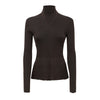 Front fastening with round gold metal buttons, turtleneck, super stretch pleated workmanship.