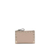 The leather Card holder by Valentino Garavani is crafted from grained calfskin and embellished with the iconic platinum-finish Rockstuds. It features a snap-button closure, a zipped coin compartment, six card slots and two flat pockets, offering a compact and luxurious blend of functionality and signature style.