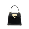 The Iconic leather Handbag by Ferragamo is a high-class piece that combines elegance and functionality. The refined geometric design is accentuated by the flap closure on the front and the Gancini plaque in gold metal, the brand’s unmistakable symbol. The top handle allows for comfortable carry by hand, while the metal feet at the base protect the bag and preserve its shape. Made of patent leather, this bag has a polished and sophisticated look. Inside, the single compartment offers enough room for essentials, making it perfect for a stylish and practical look.
