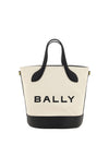 Details: Calfskin Bucket Bag by Bally, double flat hard leather handle, iconic brand monogram printed in contrast on the front, fabric design with leather inserts, single internal compartment, removable and adjustable leather flat shoulder strap.