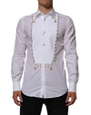 Absolutely stunning, 100% Authentic brand new Dolce & Gabbana white dress shirt, crafted in crisp cotton and adorned with an ornate gold-tone chain and faux pearl detailing. A striking formalwear piece that blends classic tailoring with runway-level flair.