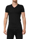 Dolce & Gabbana Black Cotton Tattered Logo V-Neck Men T-shirt