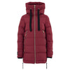 Burgundy Padded Down Jacket with Gold Zip by Moose Knuckles. Front fastening with gold metal zip, two large side pockets with zips, medium length, stretch knit inner detailing and Velcro straps on the cuffs. Adjustable hood with large drawstring, side zips. Small leather patch with metal logo on the sleeve. Composition: 74% Nylon, 26% Cotton