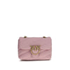 The Calfskin Love Baby Shoulder Bag by Pinko, front closure with magnetic button, iconic gold-plated Love Birds logo embossed on the front, quilted and padded design, double internal compartment, sliding chain shoulder strap, iconic brand monogram embroidered tone-on-tone on the back.