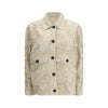The embroidered and sequined Jacket by Brunello Cucinelli delivers a refined elegance with strong visual impact. Crafted from a cotton-blend fabric, it features a structured classic collar and a front button fastening with contrasting buttons, defining a sharp, sophisticated line. Chest patch pockets with flaps and long sleeves with buttoned cuffs reference traditional tailoring codes. The jacket is enriched with all-over embroidery and applied sequins, arranged in an organic motif inspired by natural elements, extending across the entire back. A slightly boxy silhouette adds a contemporary balance, making this piece both distinctive and refined.