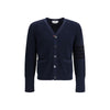 The V-neck Cardigan by Thom Browne is an elegant design featuring a V-shaped neckline and a button-front closure. It includes applied front slip pockets, signature striped armbands, and the brand’s iconic grosgrain loop tab at the back of the neck. The buttoned side vents and cuffs are finished with Thom Browne’s characteristic striped grosgrain trim, adding the label’s unmistakable touch.