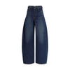The denim Trousers by Sacai present a contemporary take on a casual essential through bold volumes and refined construction. Featuring a wide-leg silhouette with an arched balloon effect, the design creates a structured yet dynamic shape, balanced by an integrated waist belt that enhances proportions. A classic five-pocket construction and button-and-zip closure complete the piece, blending functionality with Sacai’s distinctive design approach.