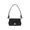 The Hazel small Shoulder Bag by Vivienne Westwood is an elegant and versatile accessory. Made from faux leather, it is embellished with a metallic Orb detail on the front. Featuring a removable flat handle and a removable metal chain shoulder strap, it can be carried on the shoulder or by hand. The magnetic button closure under the flap, the inner lining, and the protective metal feet at the base complete the design, combining practicality and iconic style.