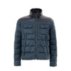 Moose Knuckles Lightweight Padded Jacket in Grey. Front zip fastening, two side zip pockets, two upper patch pockets with flaps, light padding, and an internal pocket. Contrasting upper section with shiny technical fabric, small leather patch with logo on the sleeve. Cropped fit. Composition: 74% Nylon, 26% Cotton