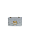The Calfskin Love Baby Shoulder Bag by Pinko, front closure with magnetic button, iconic gold-plated Love Birds logo embossed on the front, quilted and padded design, double internal compartment, sliding chain shoulder strap, iconic brand monogram embroidered tone-on-tone on the back.
