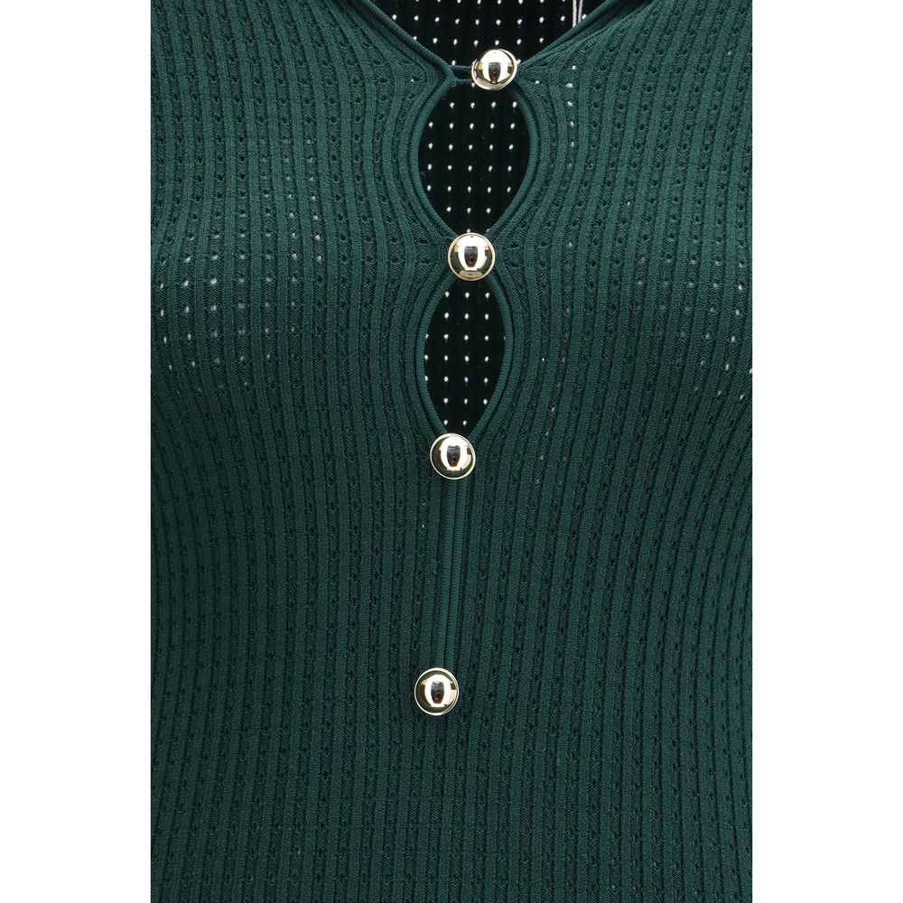 The keyhole knit midi Dress by Self-Portrait stands out for its bold interplay of structure and decorative detail. Crafted in a stretch knit that follows the body with ease, it features a sequence of keyhole cut-outs along the front, framed by refined button embellishments that add a jewellery-like accent. The exaggerated collar and softly flared cuffs enhance the silhouette with a sense of movement and personality, creating a piece that transitions effortlessly from day to evening.