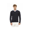 Blue modal sweater V neckline Long sleeves Fine ribbed knit on neck cuffs and bottom Regular fit Baldinini Trend monogram in metal Perfect for men who value comfort and style Material: Modal Cashmere Size on Tag: IT48 | M