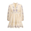 The Patience plunge Mini Dress by Zimmermann in cream, pink and violet from the Resort 2026 Collection is crafted from lightweight linen and expresses a romantic, feminine aesthetic. The design features a deep V-neckline, rouleau buttons on the bodice, and long tubular sleeves with elasticated cuffs. A fitted waist enhances the silhouette, while the flared mini skirt hem adds soft movement. The piece is finished with decorative insert panels, all-over embroidery and a scalloped hem, completed by an invisible centre-back zip closure.